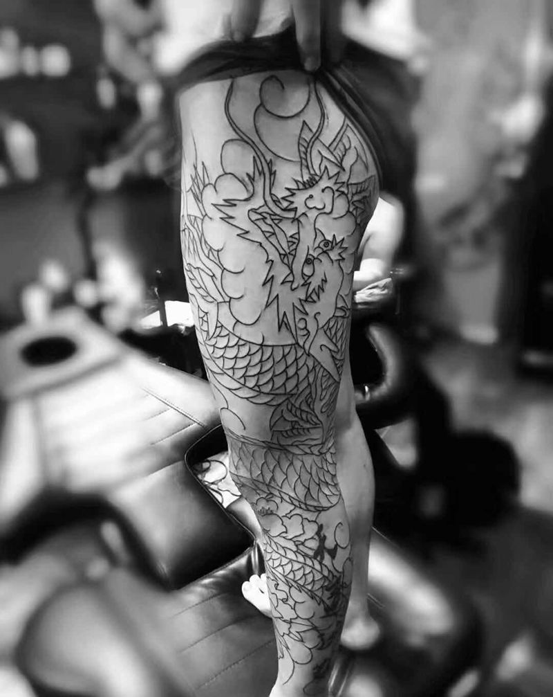 • T网红王老大花腿龙纹身图片_腿部新传统纹身图案