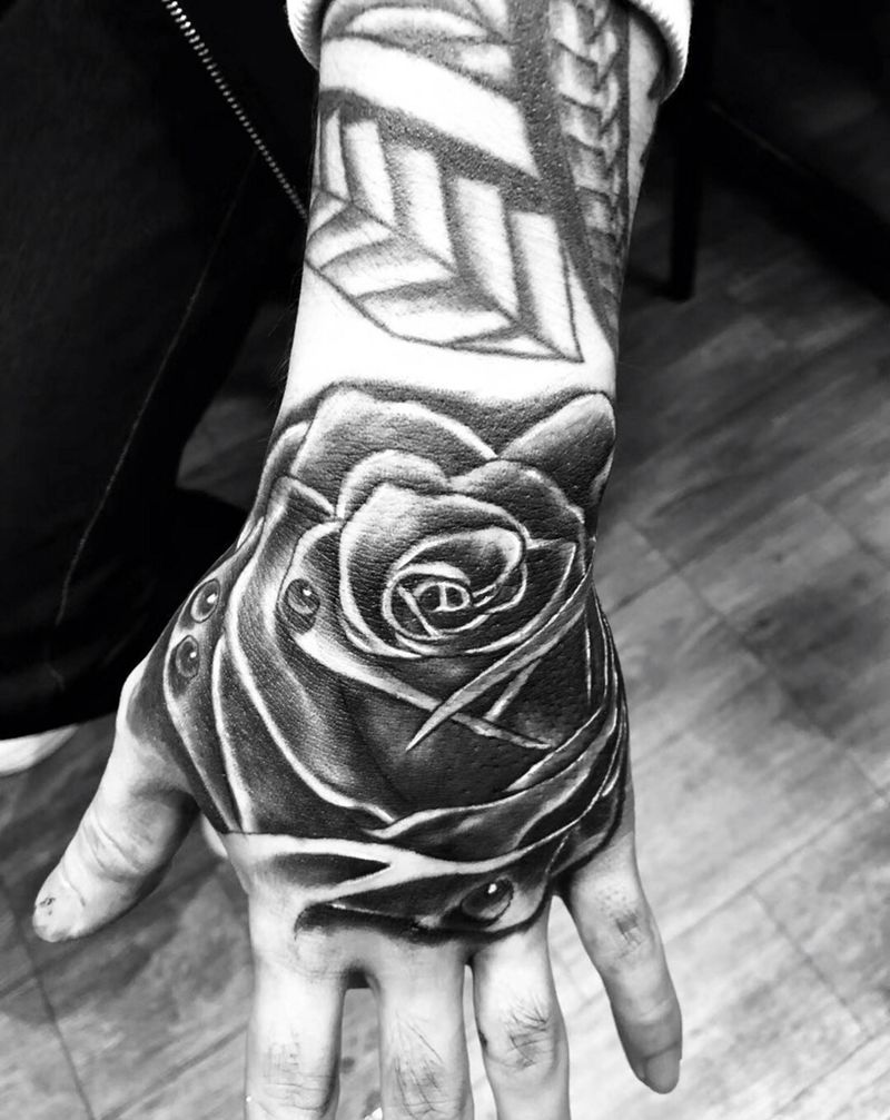 • 手背潮流时尚的玫瑰花眼睛纹身图案