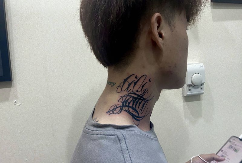 当前位置: 首页 >广东省东莞市纹身店-纹人墨客纹身工作室纹身图案>花体纹身图片_颈部花体字纹身图案