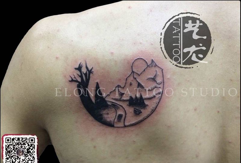 点刺 风景纹身图片_成品背部清新欧美静物纹身图案
