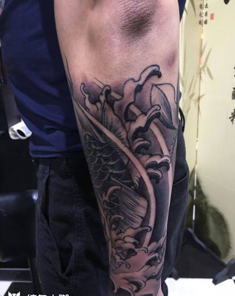 当前位置: 首页 >广东省中山市纹身店-艺龙刺青(东凤总店)纹身图案>荷花鲤鱼纹身图片_成品手臂传统动物植物纹身图案