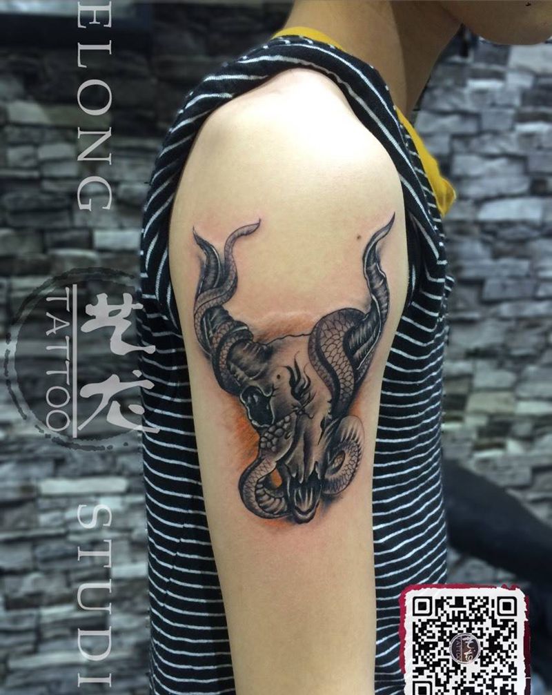 当前位置: 首页 >广东省中山市纹身店-艺龙刺青(东凤总店)纹身图案>骷髅羊头纹身图片_成品手臂传统动物纹身图案