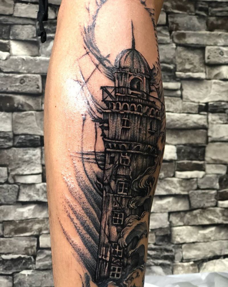 灯塔纹身图片_成品腿部欧美静物纹身图案