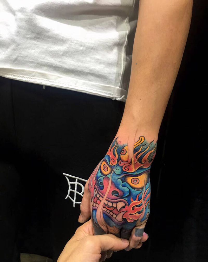 唐狮遮盖修改纹身图片_手部新传统纹身图案