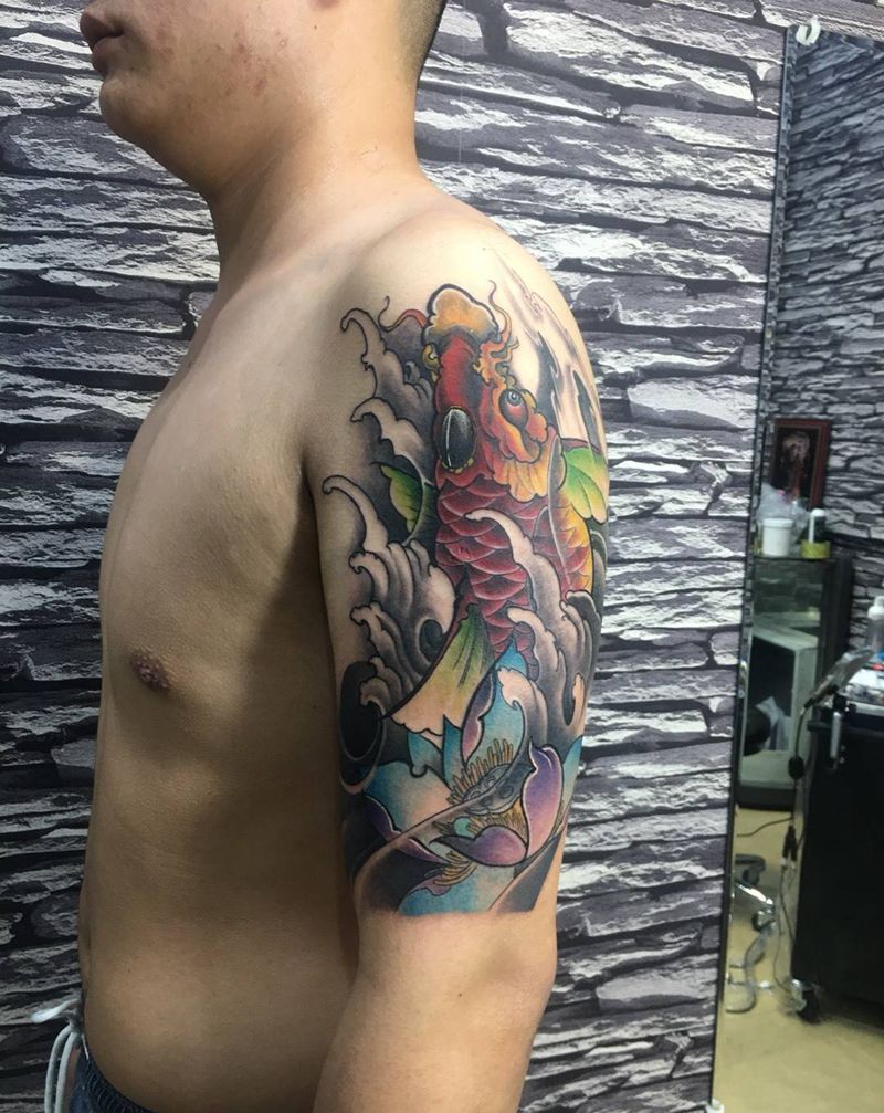 当前位置: 首页 >广东省中山市纹身店-吉刺青纹身图案>大臂彩色鲤鱼莲花纹身图片