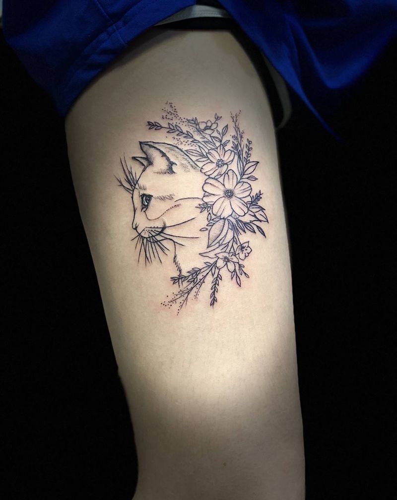 简写猫咪纹身图片_腿部点刺纹身图案