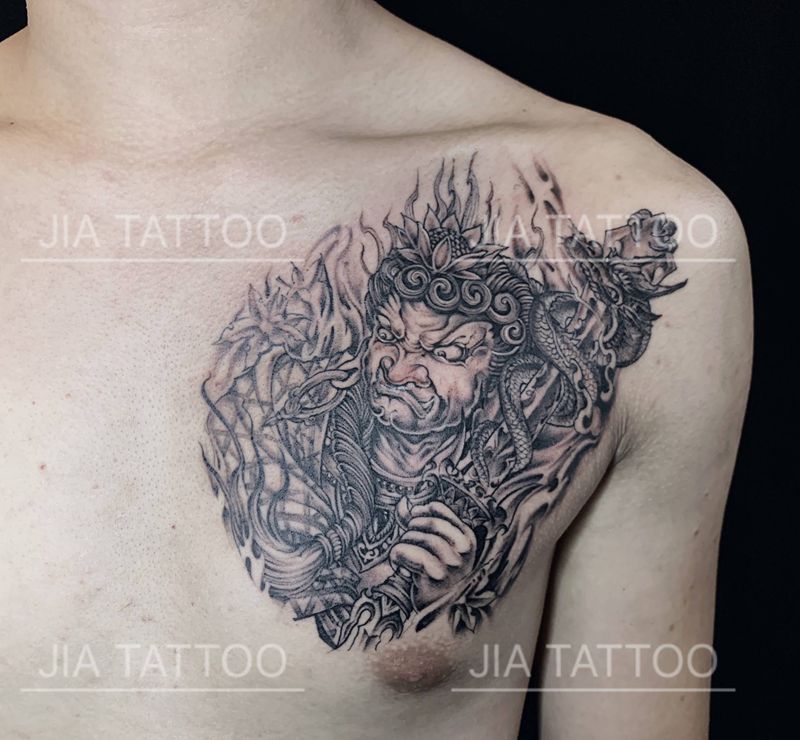 不动明王纹身图片_胸部老传统新传统纹身图案