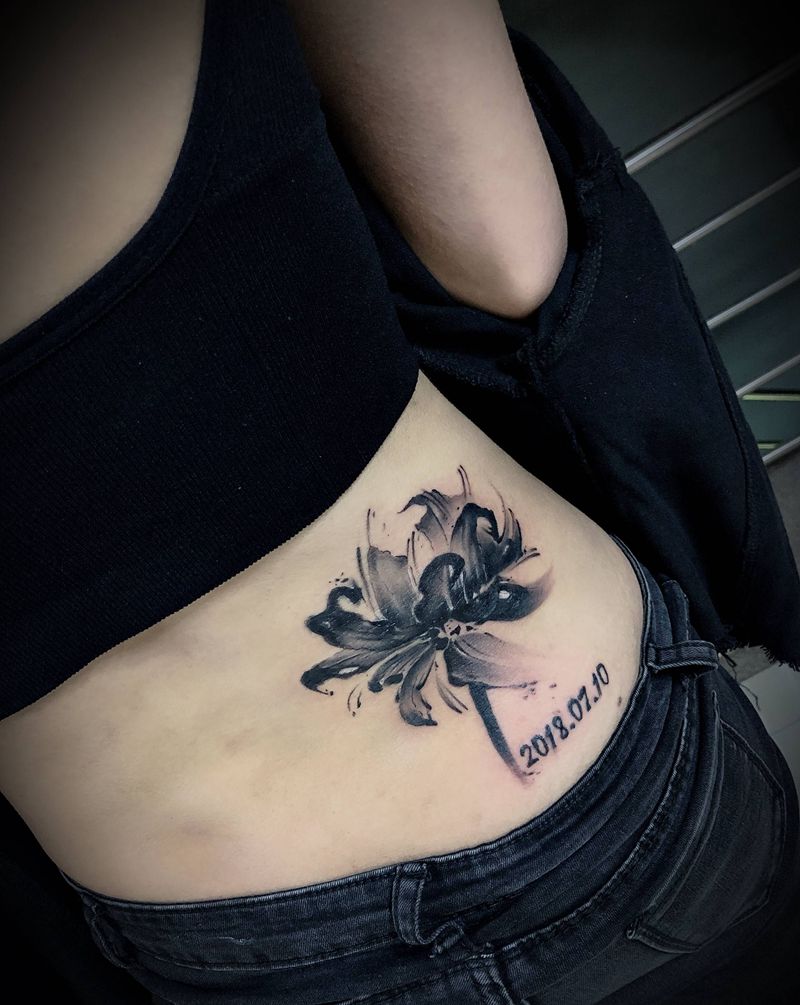 彼岸花遮盖旧图纹身图片_腰部水墨彼岸花纹身图案