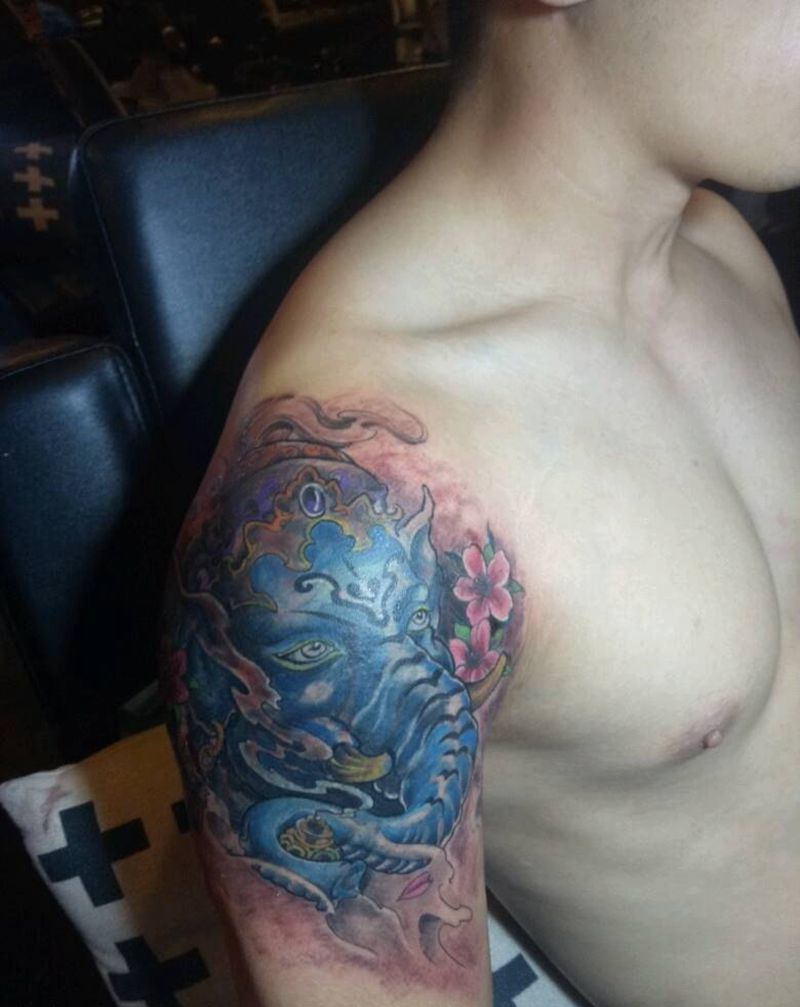 当前位置: 首页 >广西南宁市纹身店-腾刺青纹身图案>象神遮盖纹身图片_肩部手臂传统鬼神宗教成品纹身图案