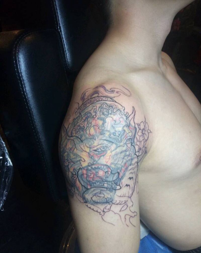 当前位置: 首页 >广西南宁市纹身店-腾刺青纹身图案>象神遮盖纹身图片_肩部手臂传统鬼神宗教成品纹身图案