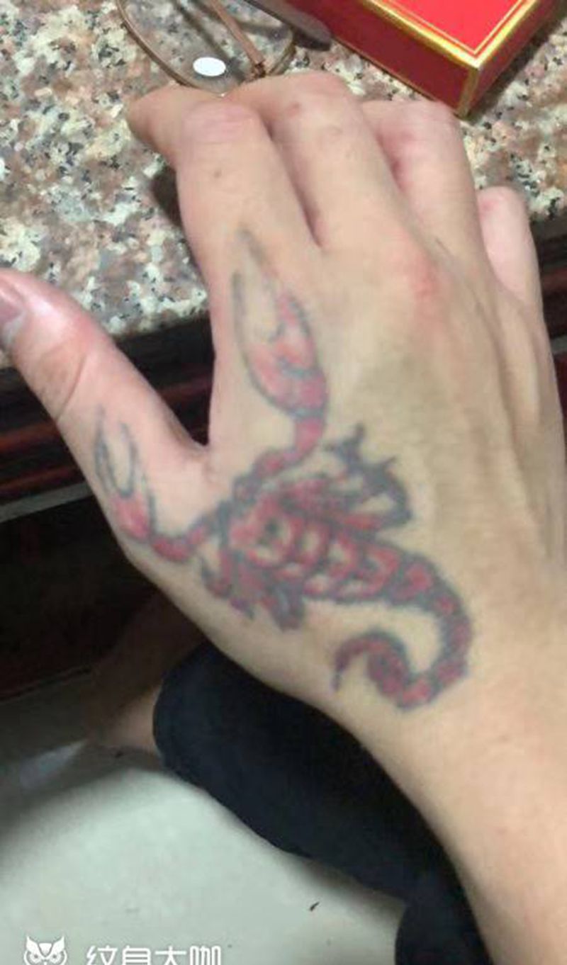 当前位置: 首页 >广东省揭阳市纹身店-战匠刺客纹身馆纹身图案>唐狮子遮盖红蝎子纹身图片_手部纹身图案