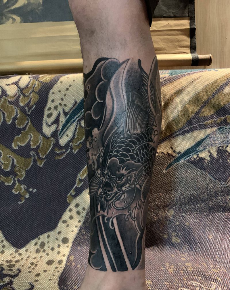 • T网红王老大花腿龙纹身图片_腿部新传统纹身图案