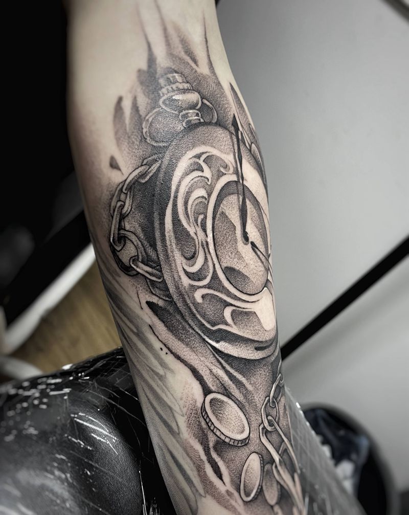 当前位置: 首页 >广东省揭阳市纹身店-畏·刺青RESPECT TATTOO纹身图案>#Time is money纹身图片_手臂点刺欧美写实纹身图案