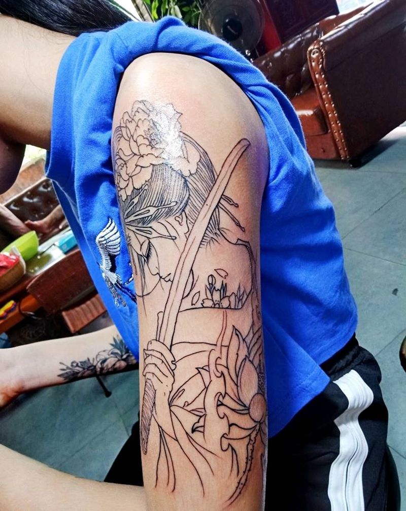 当前位置: 首页 >广西南宁市纹身店-墨徒纹身工作室纹身图案>艺伎纹身图片_手臂腿部老传统新传统艺伎荷花纹身图案