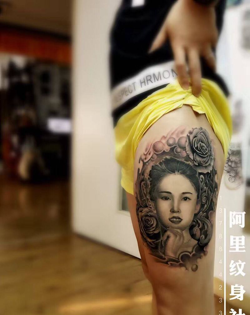 爱人纹身图片_阿里人物写实原创植物肖像成品腿部纹身图案