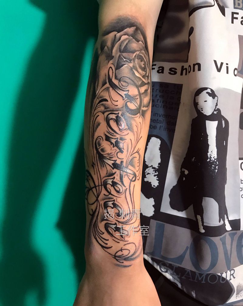当前位置: 首页 >广西南宁市纹身店-揭 ·刺青纹身图案>花体➕写实玫瑰纹身图片_手臂欧美写实花体字纹身图案