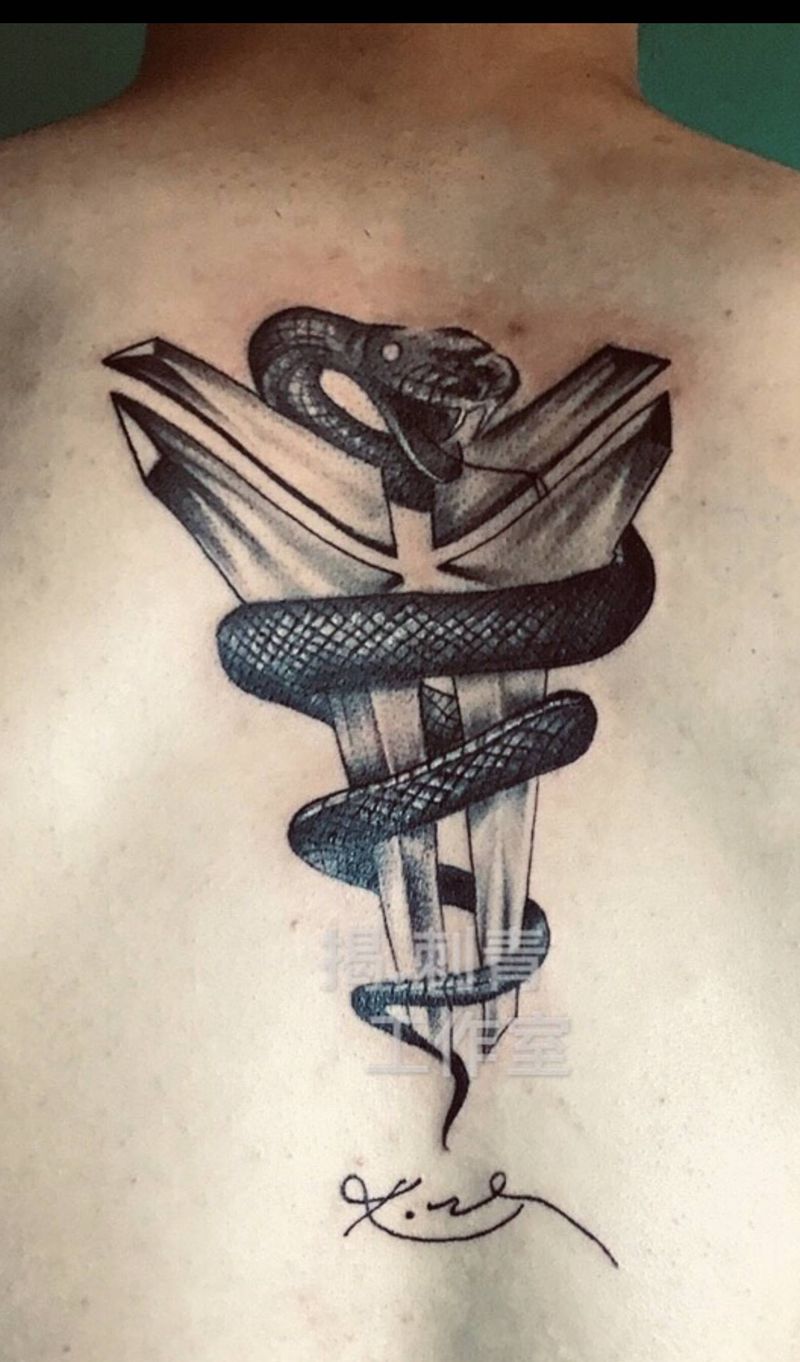 当前位置: 首页 >广西南宁市纹身店-揭 ·刺青纹身图案>黑曼巴蛇缠绕倒三角科比logo纹身图片_背部点刺纹身图案