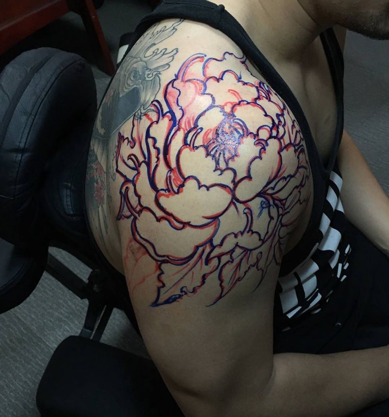 鱼牡丹纹身图片_成品肩部手臂传统动物原创植物纹身图案