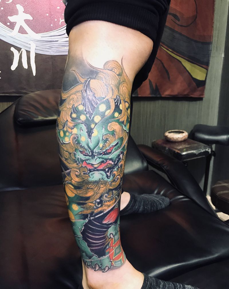 当前位置: 首页 >广西柳州市纹身店-念刺青工作室纹身图案>唐狮遮盖纹身图片_腿部新传统纹身图案