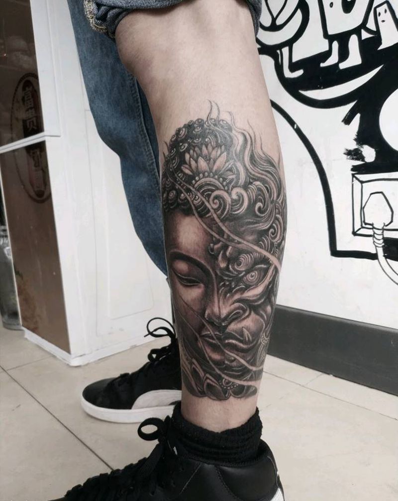 佛与魔,一念之间纹身图片_腿部新传统纹身图案