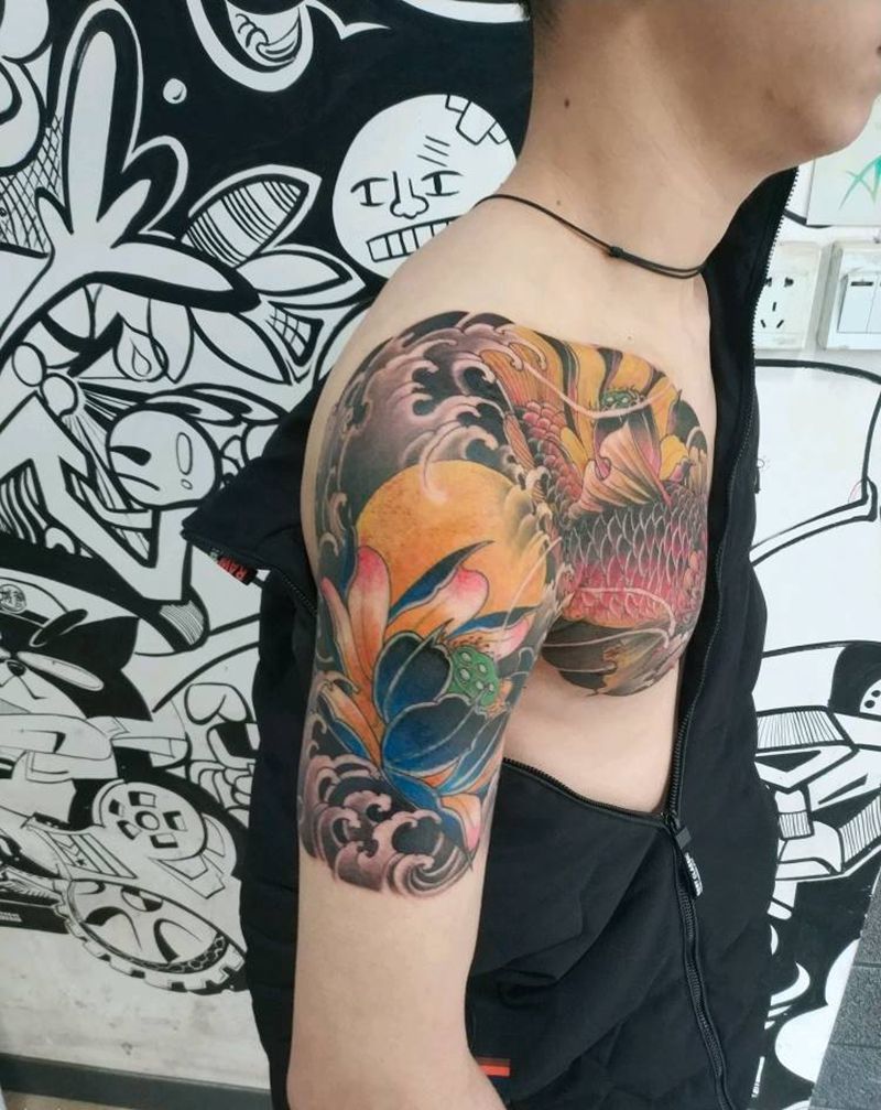 当前位置: 首页 >广西南宁市纹身店-晓龙刺青专业纹身纹身图案>半胛 鲤鱼荷花纹身图片_胸部新传统纹身图案