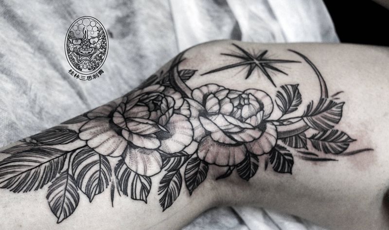 素花纹身图片_腿部欧美写实点刺纹身图案