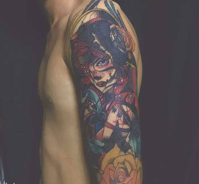 大臂艺姬遮盖纹身图片_手臂欧美写实纹身图案
