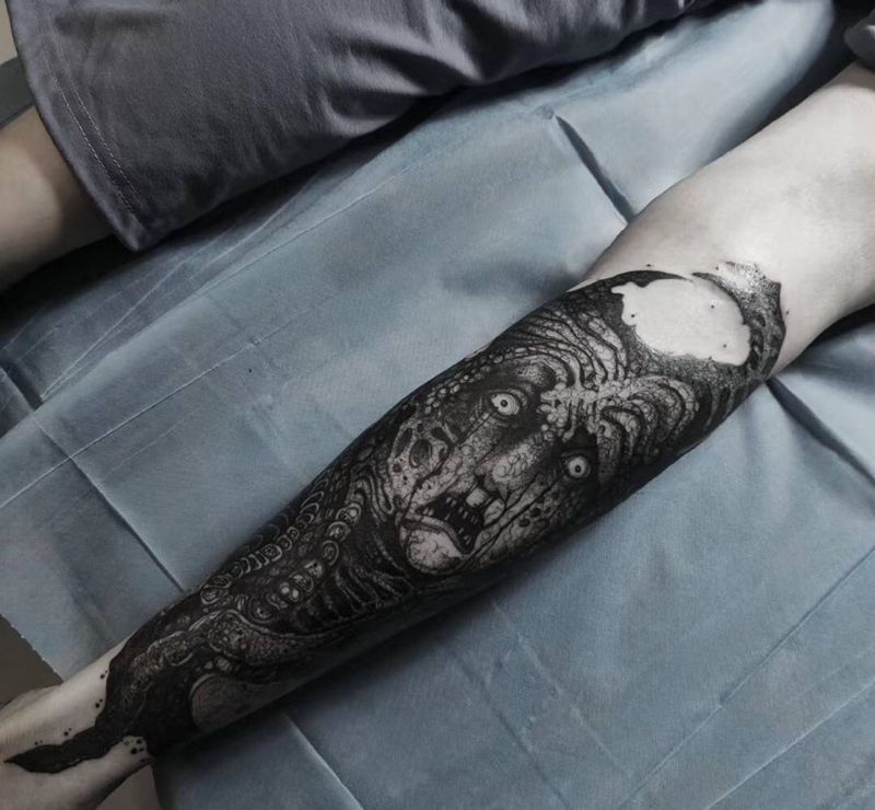 当前位置: 首页 >广西北海市纹身店-7号铁刺青纹身图案>设计 暗黑小腿纹身图片_腿部纹身图案