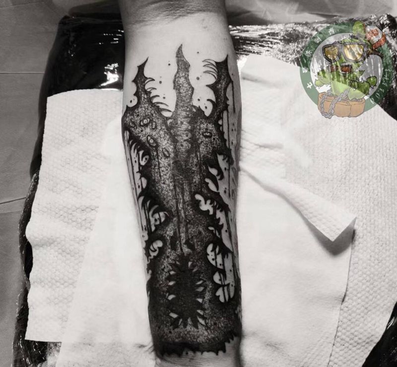 当前位置: 首页 >广西北海市纹身店-7号铁刺青纹身图案>即兴手绘暗黑遮盖纹身图片_手部不规则纹身图案