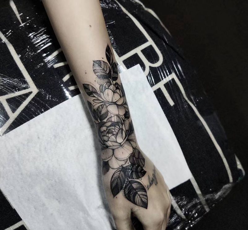 • 手背潮流时尚的玫瑰花眼睛纹身图案