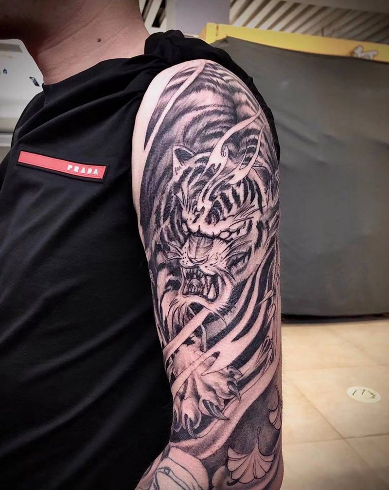 • T网红王老大花腿龙纹身图片_腿部新传统纹身图案