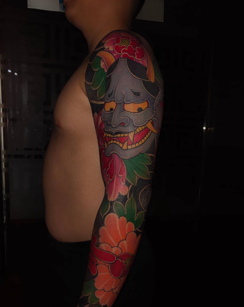 驻店纹身师雪妃老传统作品纹身图片_手臂老传统天狗 般若纹身图案