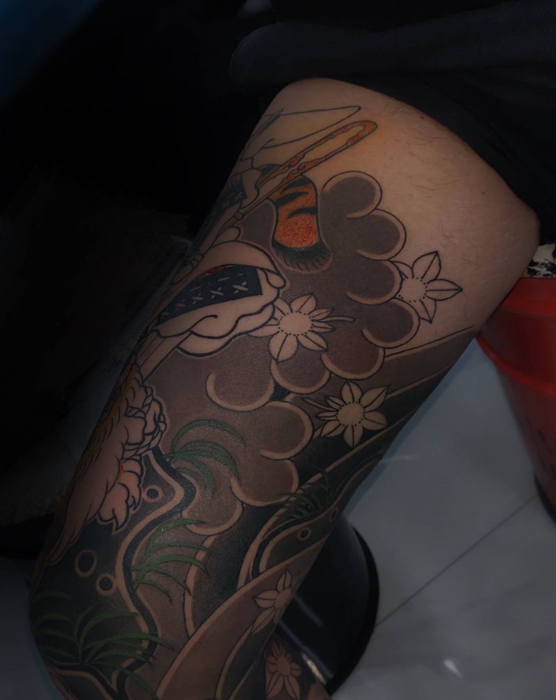 驻店纹身师阿修老传统未完成作品纹身图片_腿部老传统纹身图案