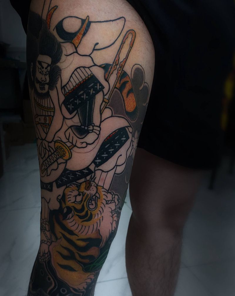 当前位置: 首页 >广西桂林市纹身店-燕刺青纹身工作室纹身图案>驻店纹身师阿修老传统未完成作品纹身图片_腿部老传统纹身图案