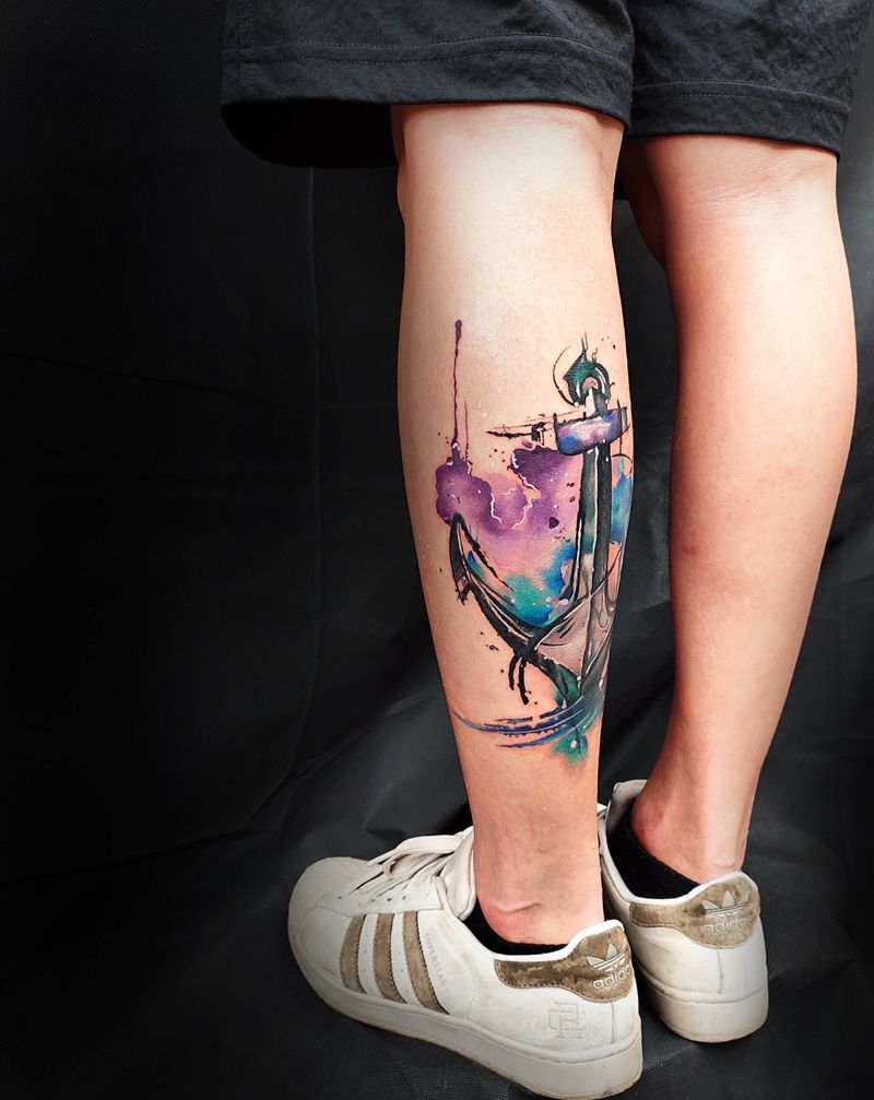 水彩船锚⚓️纹身图片_腿部水彩水彩纹身图案