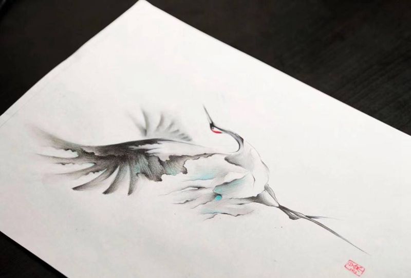 水墨の仙鹤纹身图片_手稿成品国画动物纹身图案
