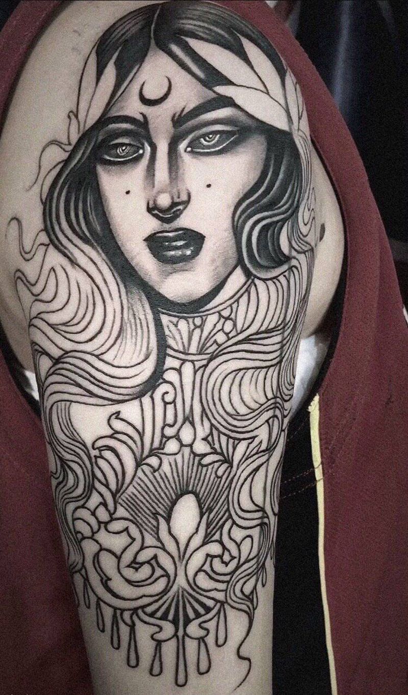 遮盖暗黑女神纹身图片_手臂Old School纹身图案
