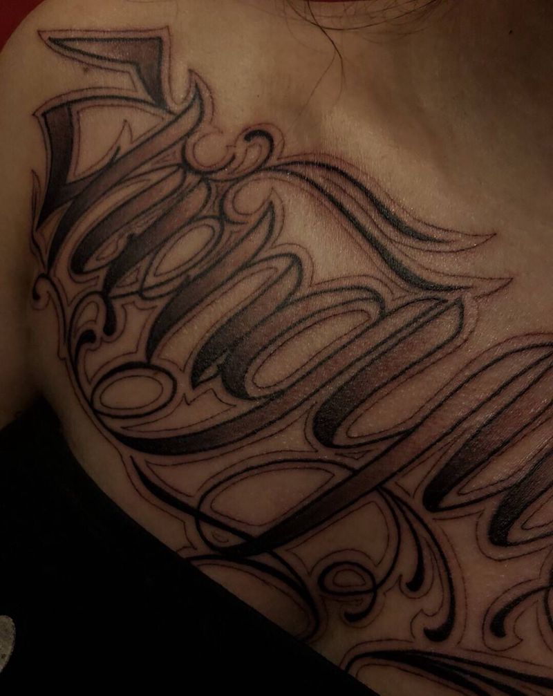当前位置: 首页 >广西梧州市纹身店-梧州天越刺青纹身图案>花体字纹身图片_胸部花体字纹身图案