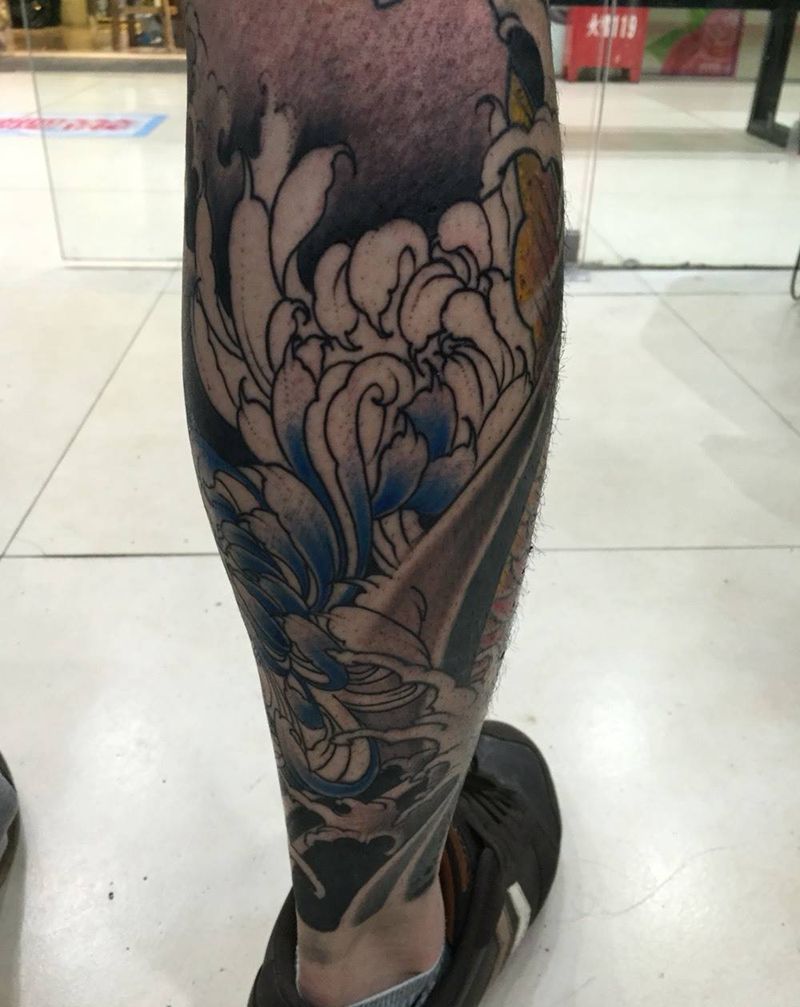 当前位置: 首页 >广西梧州市纹身店-梧州天越刺青纹身图案>菊花包小腿纹身图片