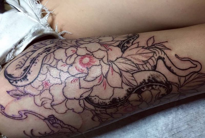 • T网红王老大花腿龙纹身图片_腿部新传统纹身图案