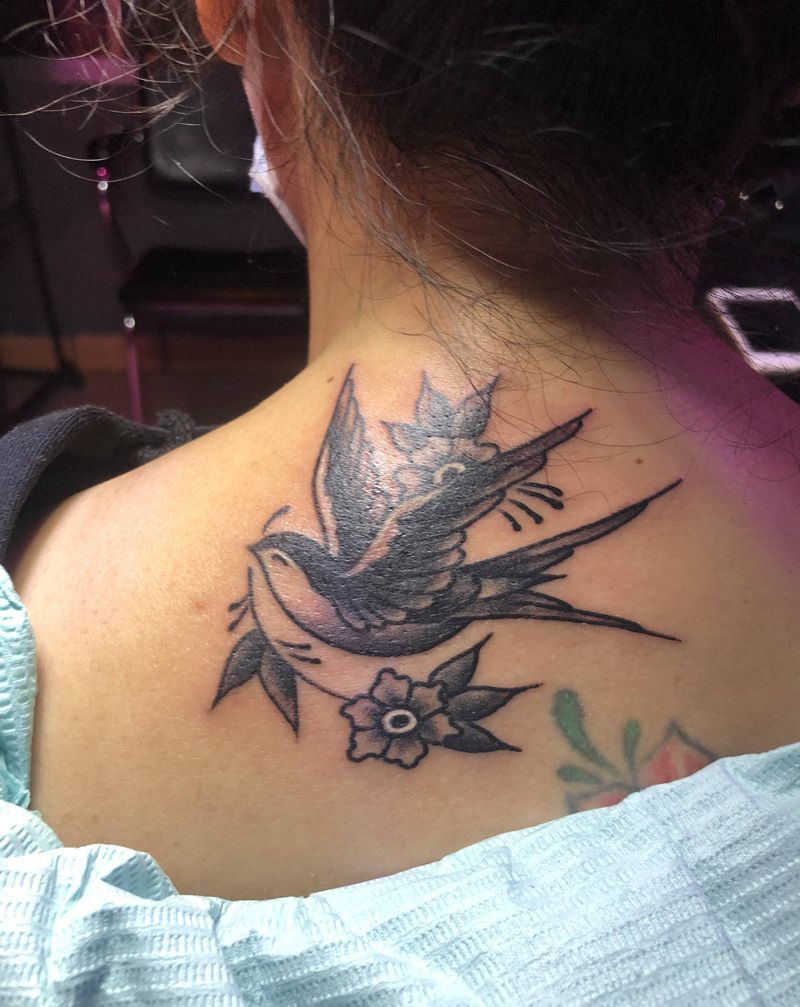 当前位置: 首页 >广西梧州市纹身店-墨针缘刺青工作室纹身图案>燕子纹身图片_背部Old School纹身图案