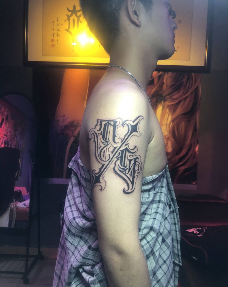 当前位置: 首页 >广西梧州市纹身店-墨针缘刺青工作室纹身图案>花体字纹身图片_手臂花体字纹身图案
