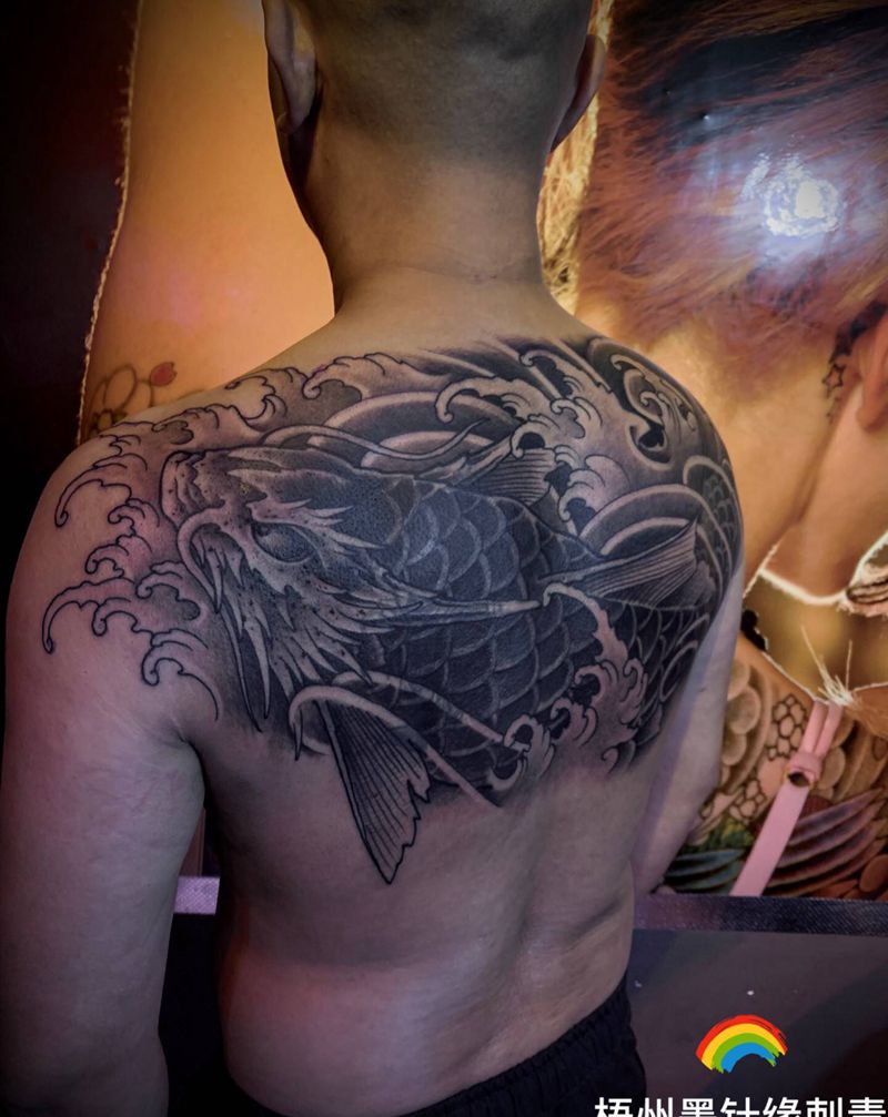 当前位置: 首页 >广西梧州市纹身店-墨针缘刺青工作室纹身图案>鳌鱼遮盖鲤鱼纹身图片_背部新传统纹身图案