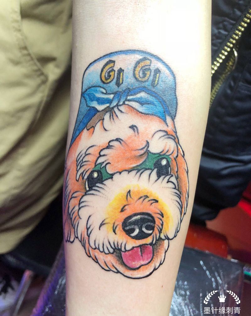 当前位置: 首页 >广西梧州市纹身店-墨针缘刺青工作室纹身图案>小狗纹身图片_手部New School小狗纹身图案