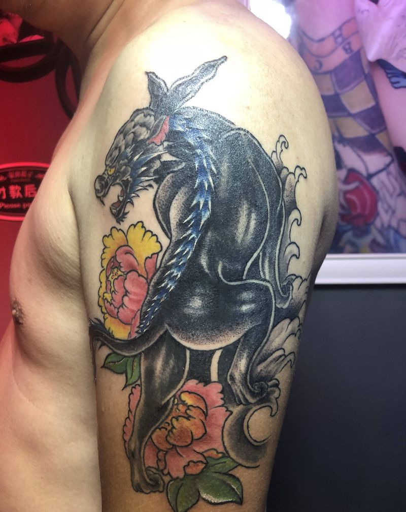 • T网红王老大花腿龙纹身图片_腿部新传统纹身图案