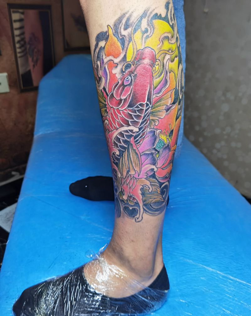 • T网红王老大花腿龙纹身图片_腿部新传统纹身图案