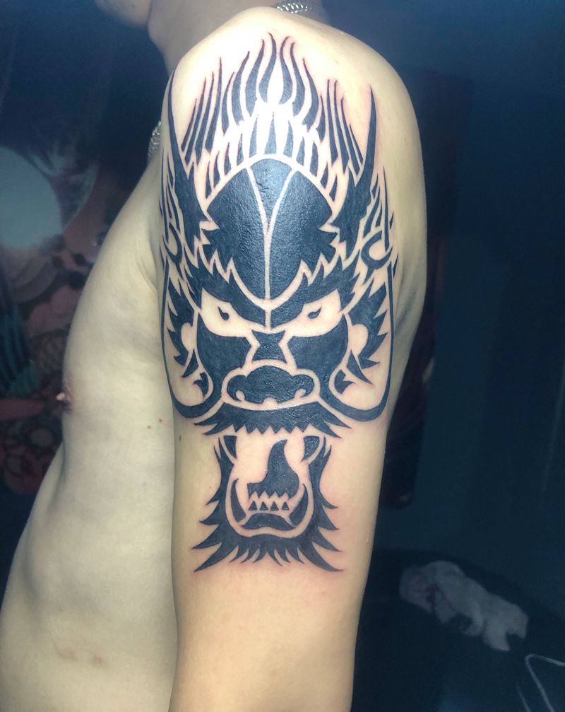 当前位置: 首页 >广西梧州市纹身店-墨针缘刺青工作室纹身图案>龙头图腾纹身图片_手臂纹身图案