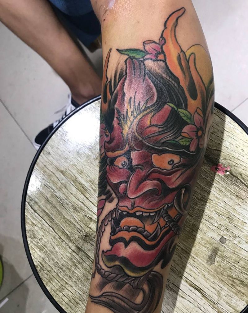 • T包小腿吹火男+阿多福纹身图片_腿部老传统新传统吹火男阿
