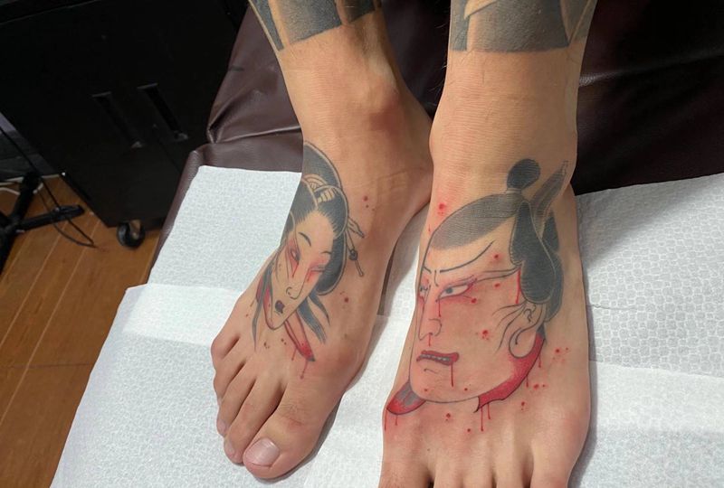 生首纹身图片_背部脚部老传统纹身图案