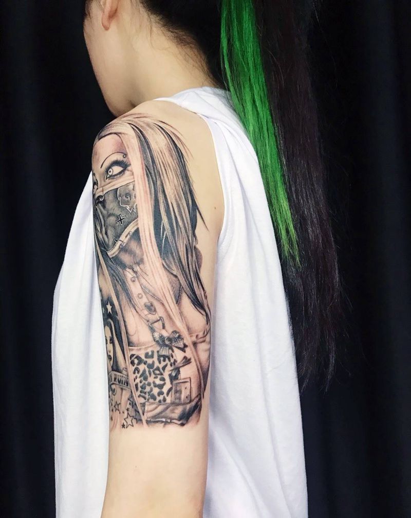 当前位置: 首页 >广西梧州市纹身店-濸刺青纹身图案>小丑女纹身图片_手臂手部欧美写实纹身图案